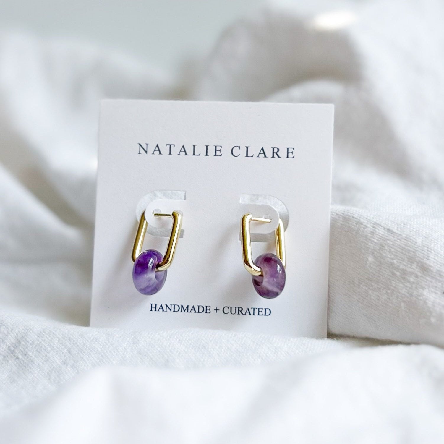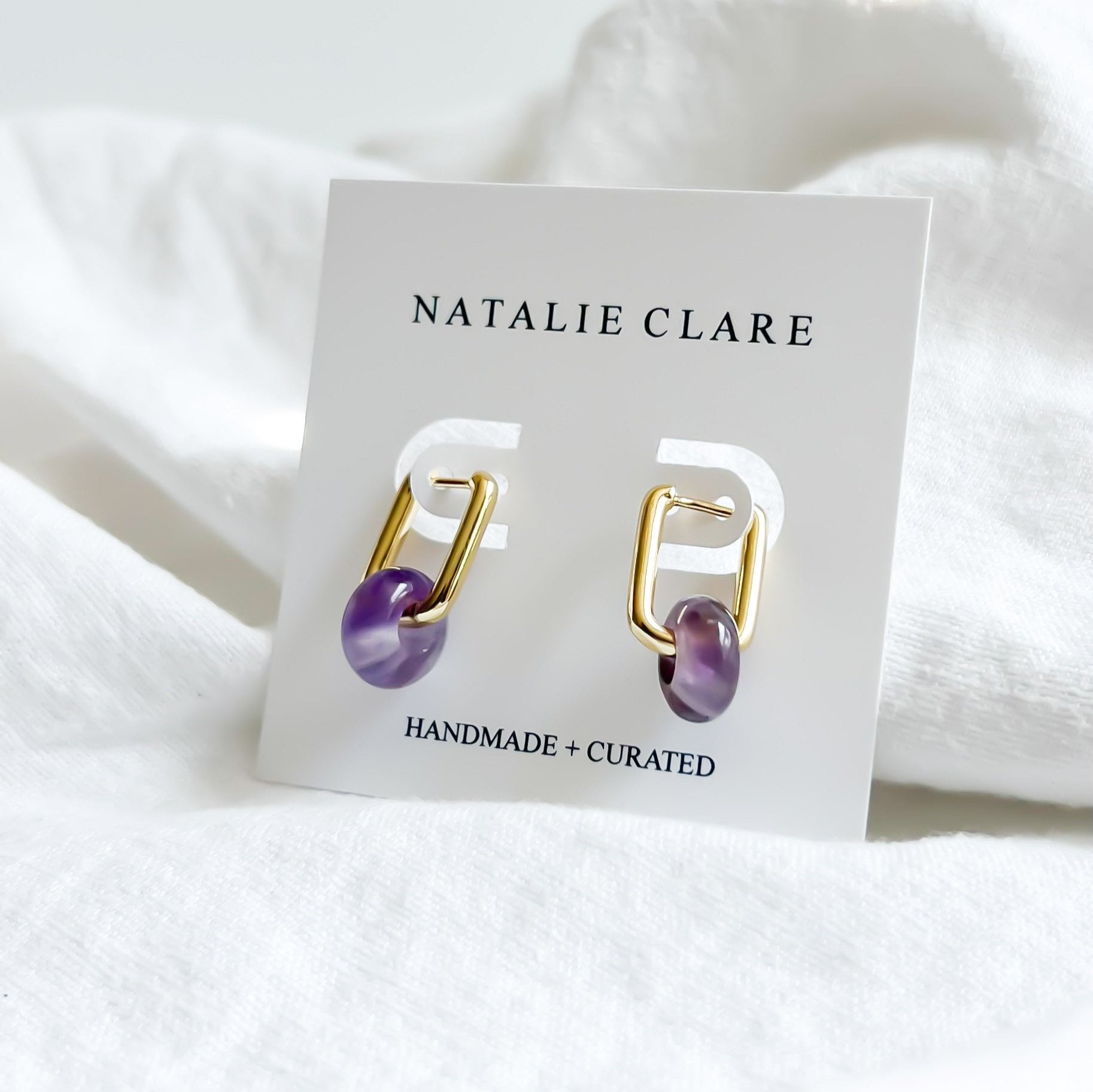 Crafted with natural amethyst rondelle beads and an 18k gold plated brass huggie hoop, our Amethyst Huggie Hoops add a touch of something special to any look.Â