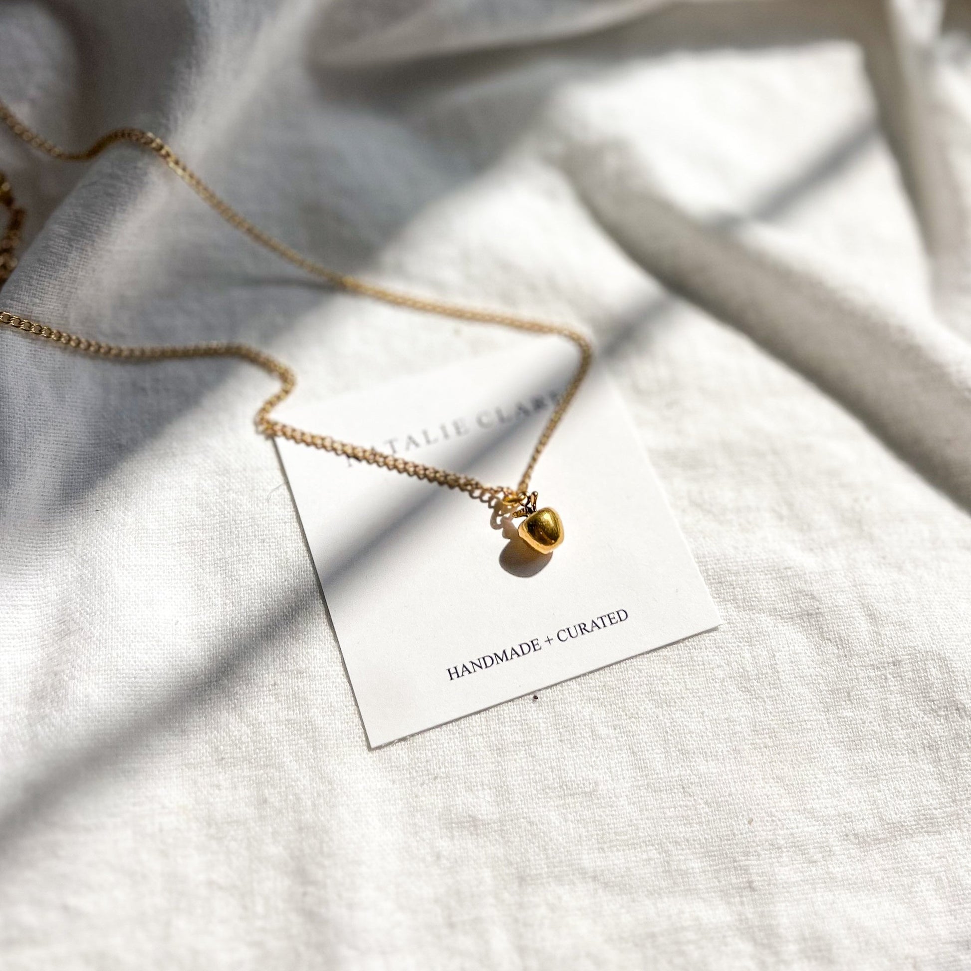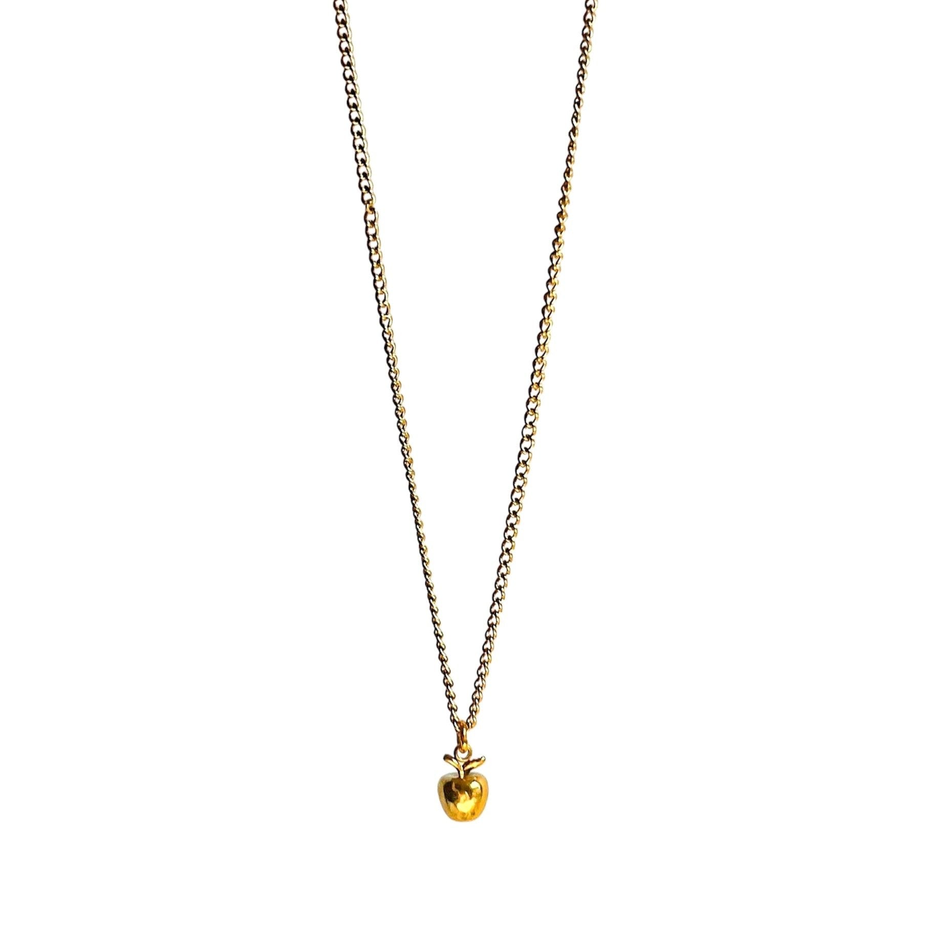 Indulge in the crisp and sweet design of our Honey Crisp Necklace. Crafted from stainless steel and 18k gold plating, this 3D apple charm hangs delicately from a 19 inch curb chain.Â