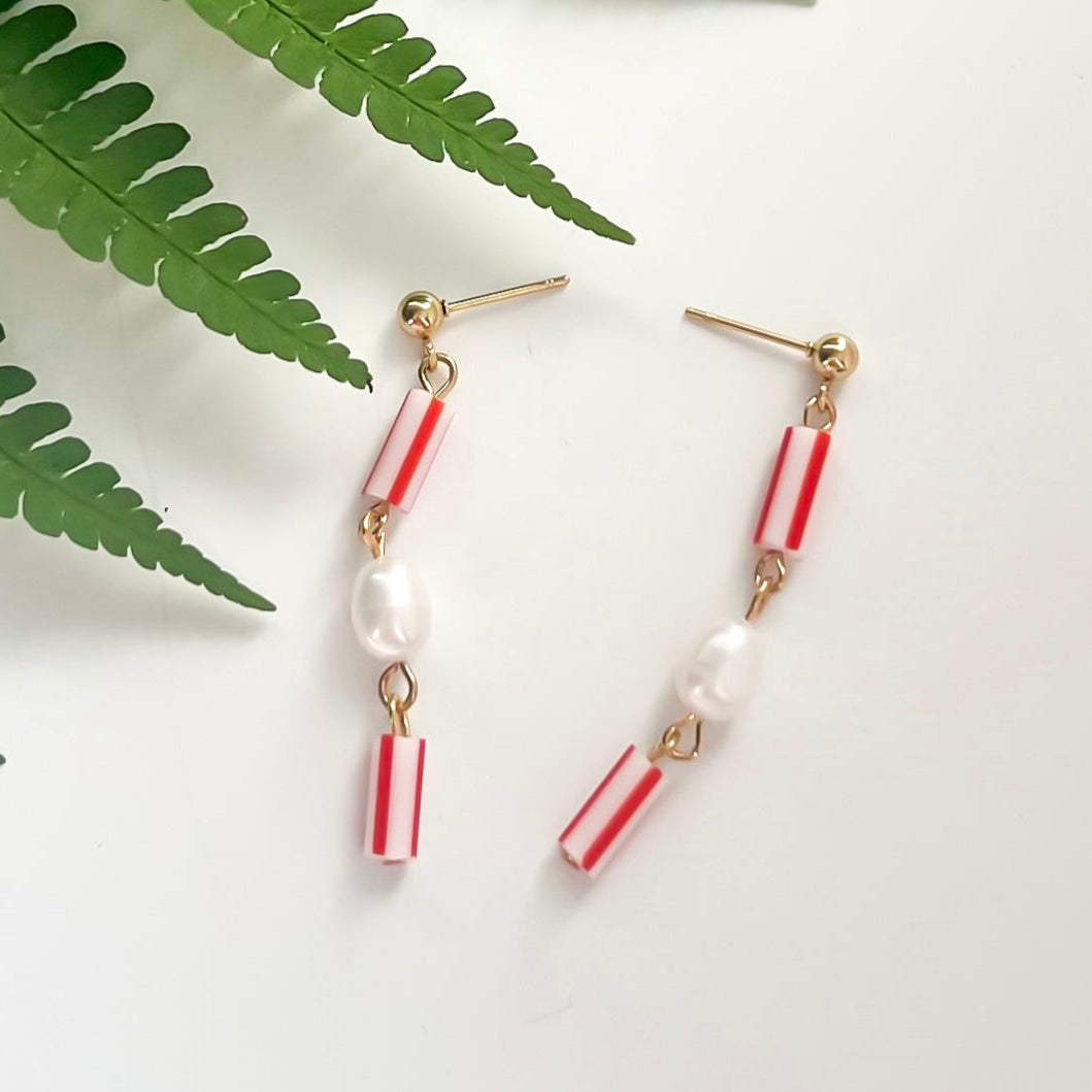 The Candy Cane Earrings feature two crimson and white striped acrylic beads separated by a lustrous freshwater pearl, creating a refined yet playful aesthetic. Crafted with stainless steel posts plated in 18k gold, these earrings offer durability and a sophisticated finish.