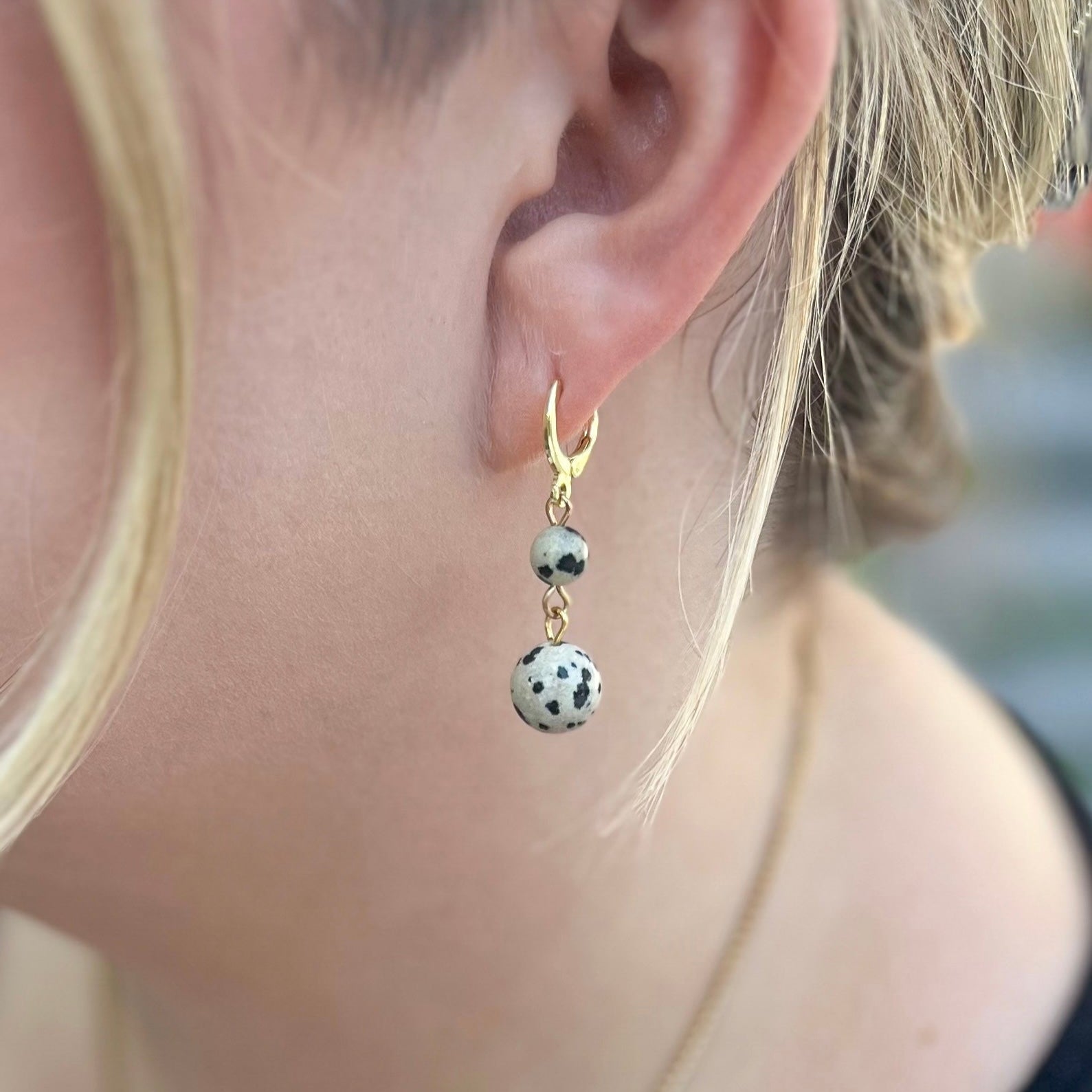 These huggie hoop earrings feature natural Dalmatian jasper beads, renowned for their distinctive spotted appearance. Crafted with 18k gold plated stainless steel, they offer both durability and a refined, hypoallergenic finish.Â