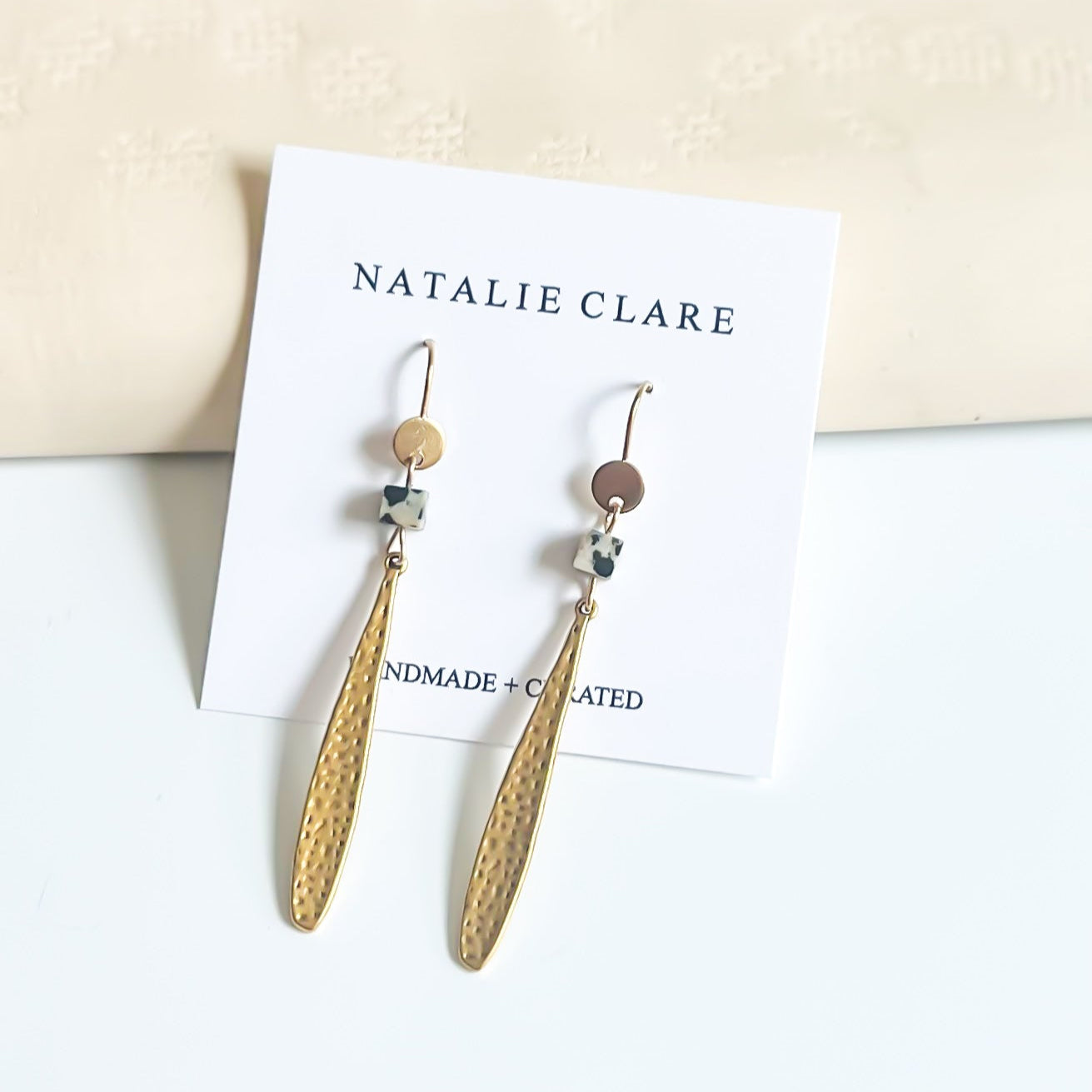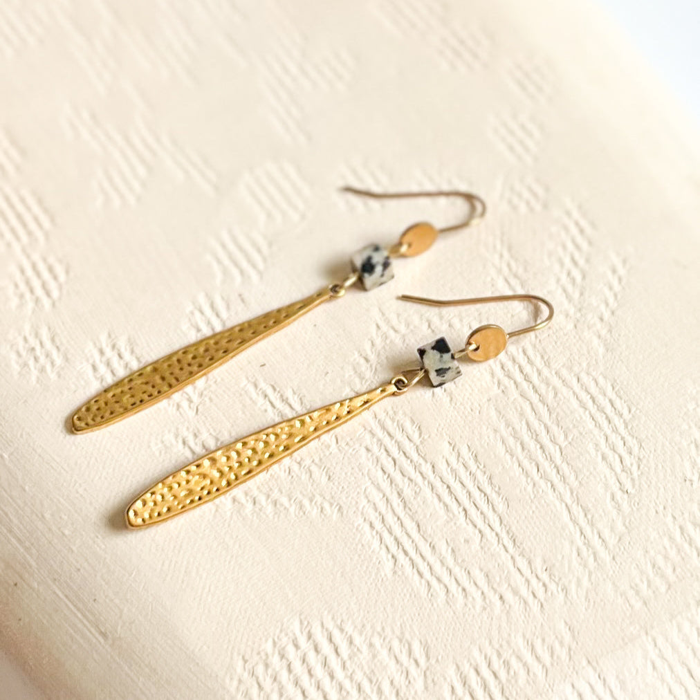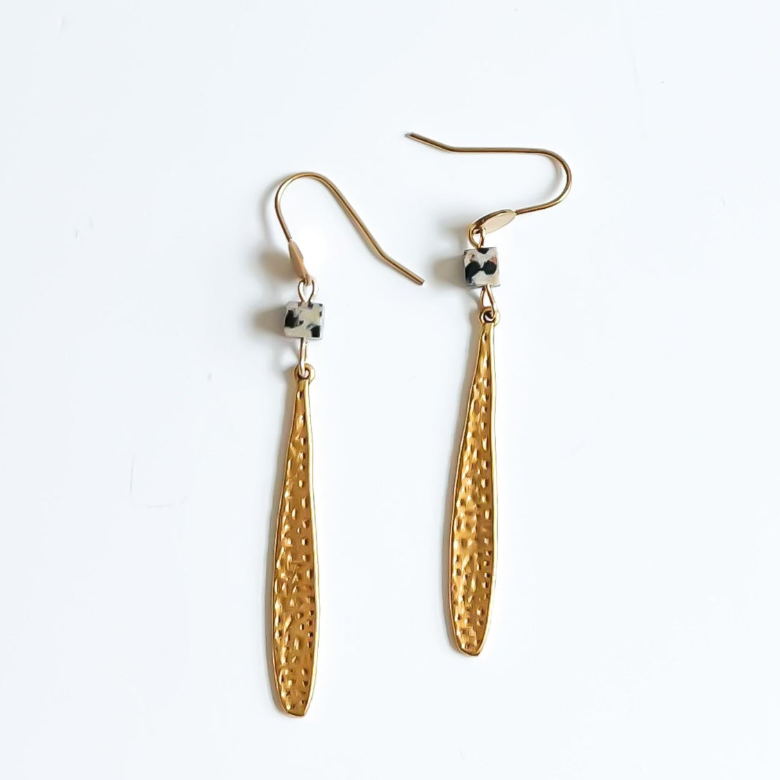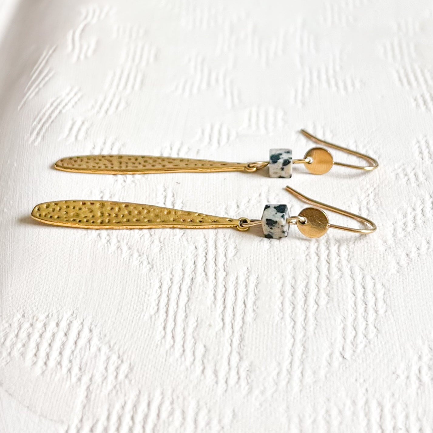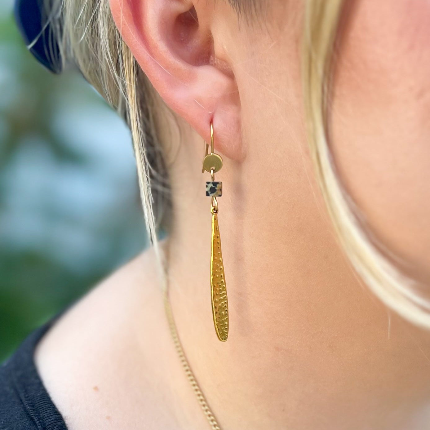 The Dragonfly Wing Earring combines refined design with natural elements. It features an 18k gold plated earring hook for durability and a polished finish. The centerpiece is a natural Dalmatian jasper cube stone, lending each piece unique character. A raw brass dragonfly wing charm adds an artisanal touch, expertly balancing elegance and organic style for a sophisticated accessory.