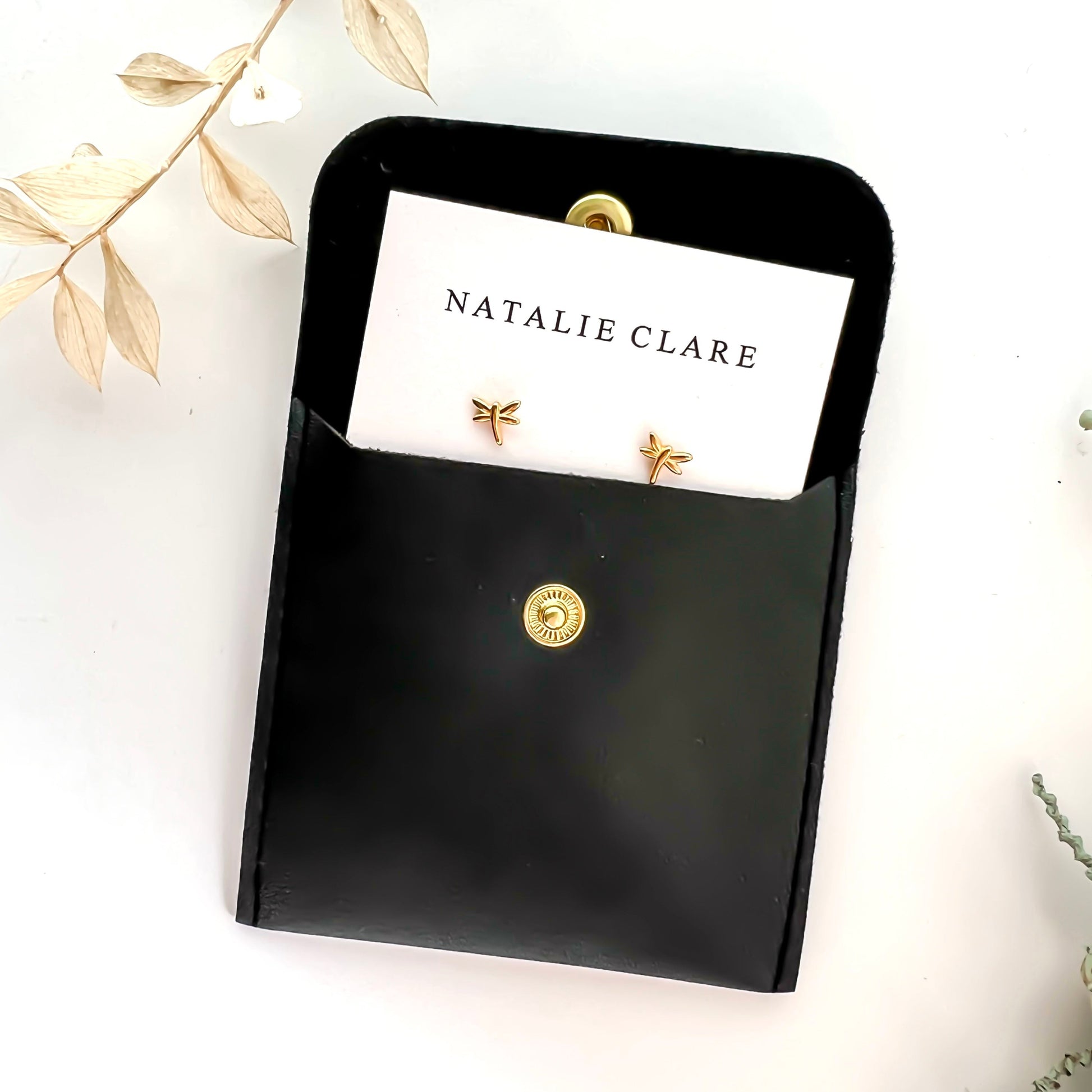 This little pouch is made of vegan leather with a gold snap closure. It fits any Natalie Clare jewelry in it perfectly for gifting. Add it to an order for gift wrapping for an in person gift or send as a gift to a friend, ready to open in the package.Â