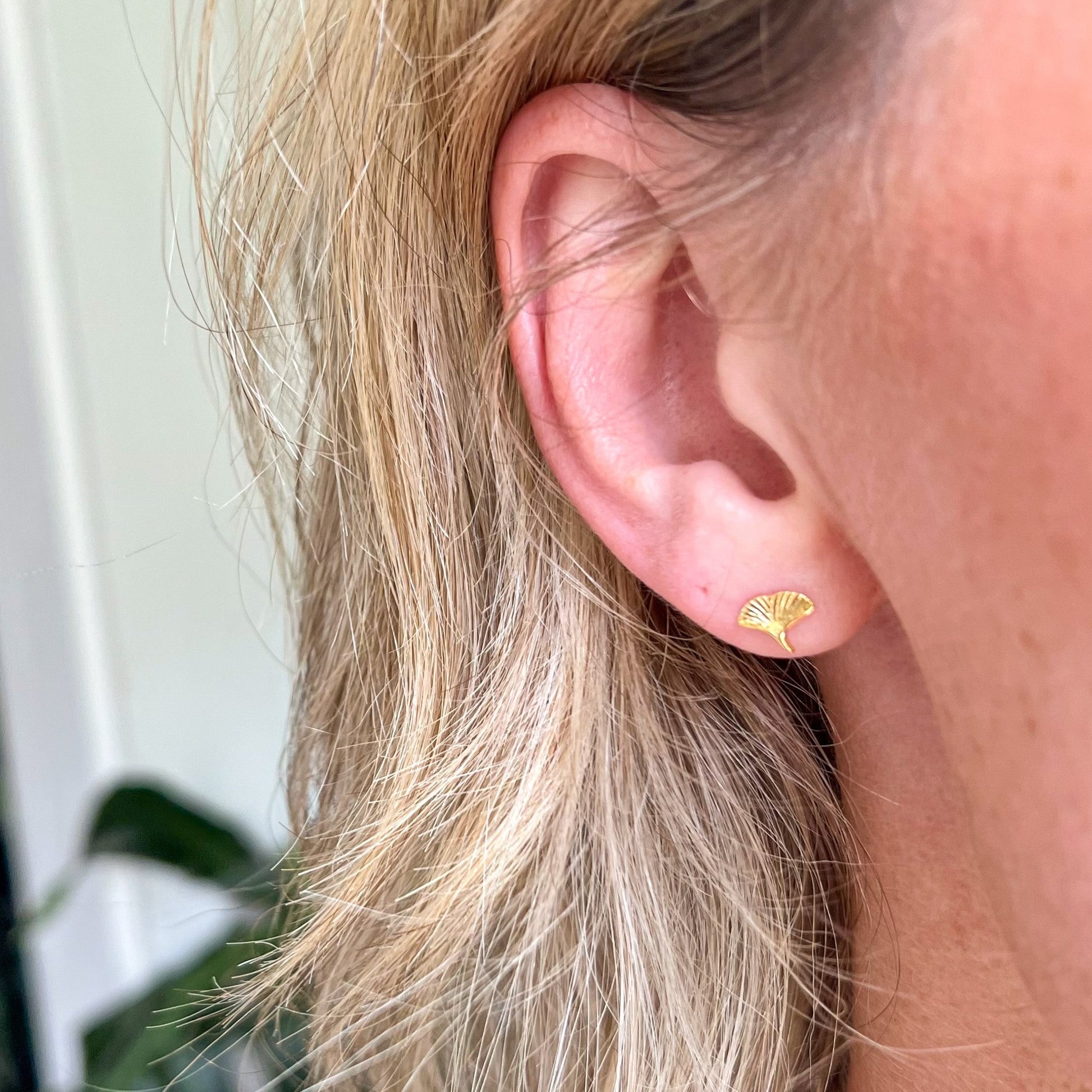 These dainty Ginkgo Stud earrings are perfect for a minimal earring look that expresses your love of nature. These small studs have a brass base and are plated with real 18K gold and are nickel free.Â