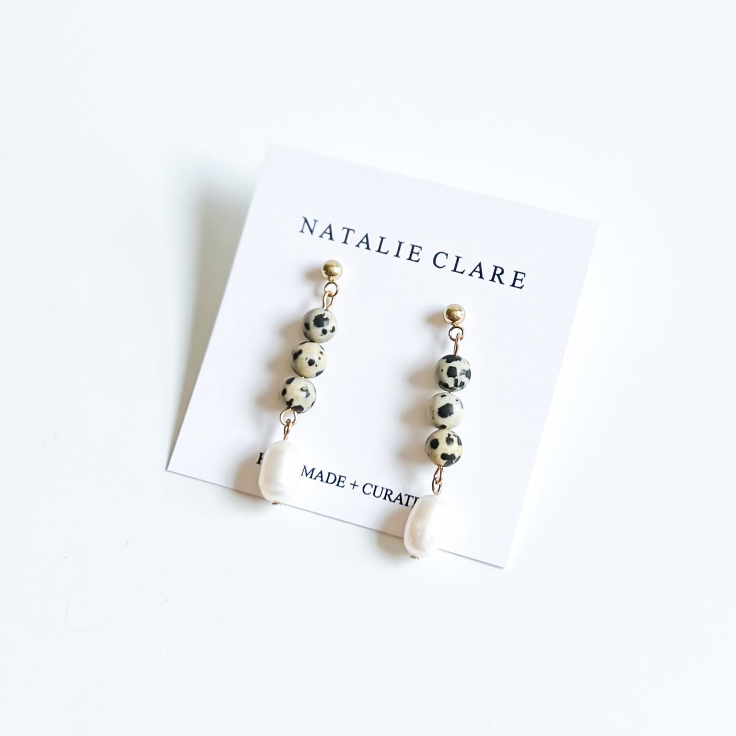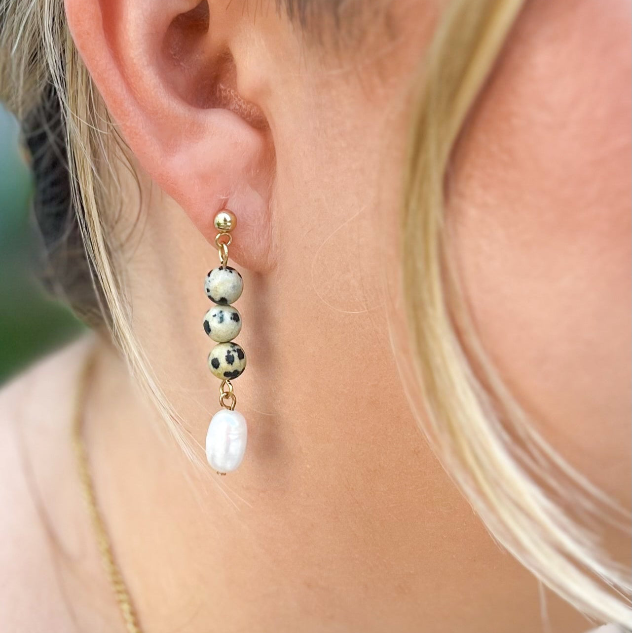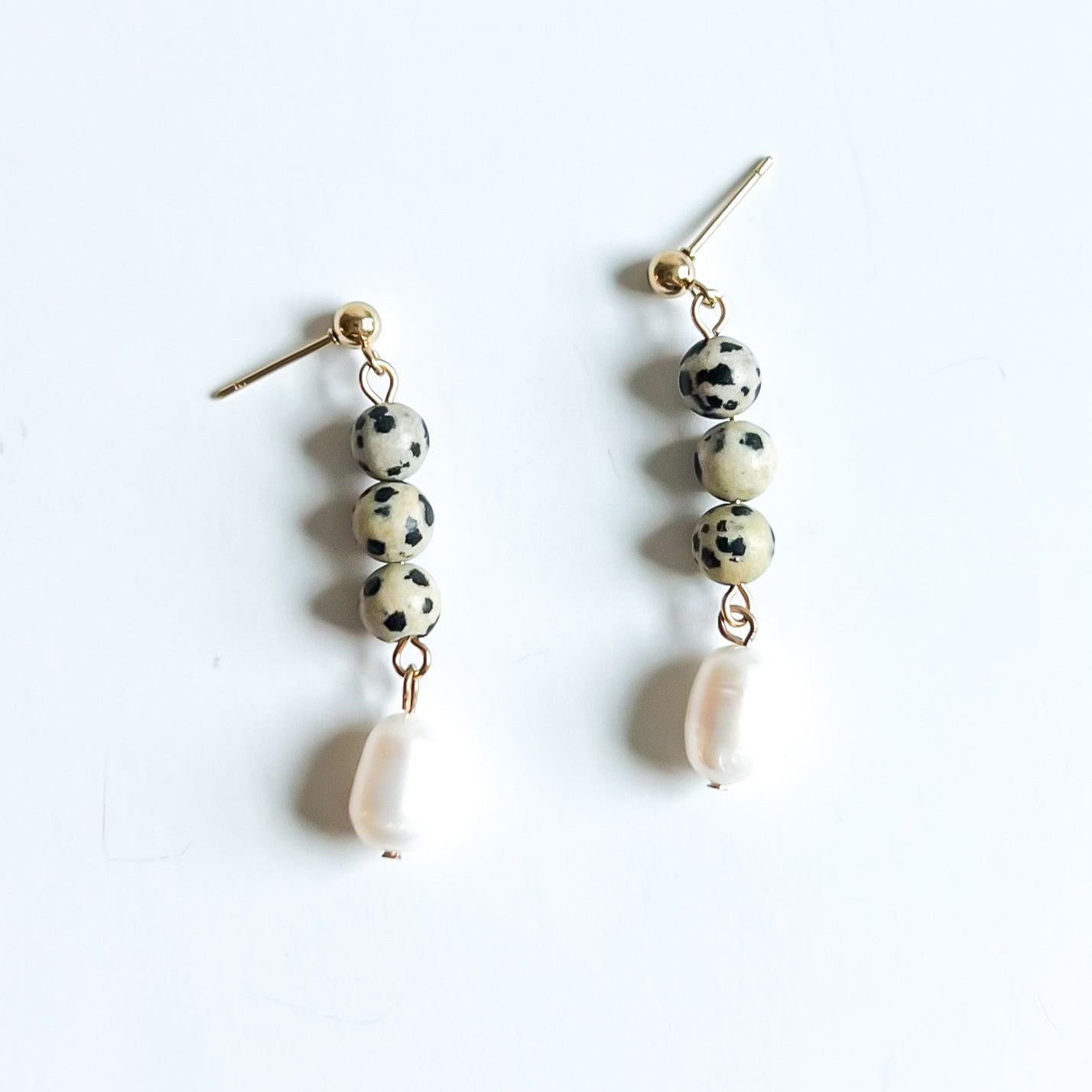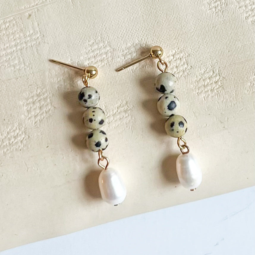 These Jasper and Pearl Drop Earrings combine the smooth elegance of freshwater natural pearl beads with the distinctive speckled beauty of natural dalmatian jasper 6mm beads. Suspended from refined 14k gold plated ball stud earrings, this design offers both durability and sophisticated style.Â