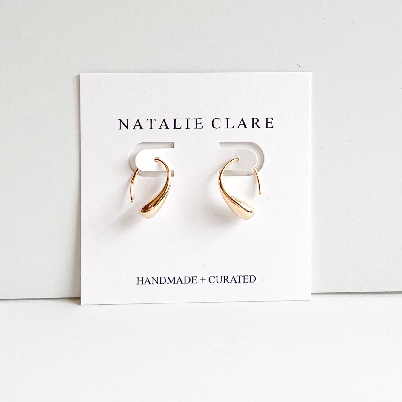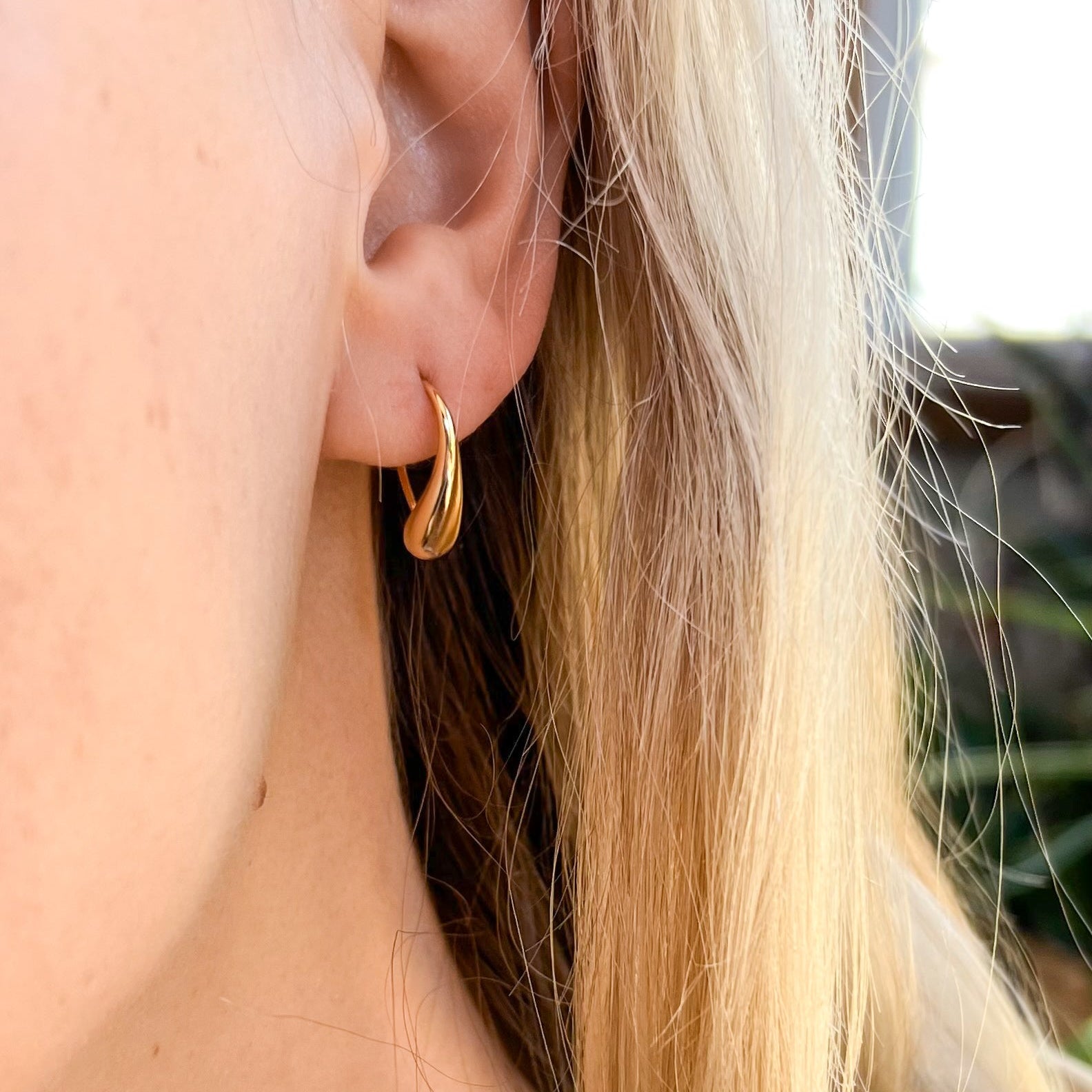 Elegant raindrop-shaped hoops crafted from a nickel-free brass base and finished with 18k gold plating. These lightweight earrings combine timeless design with hypoallergenic materials, making them ideal for sensitive skin.Â