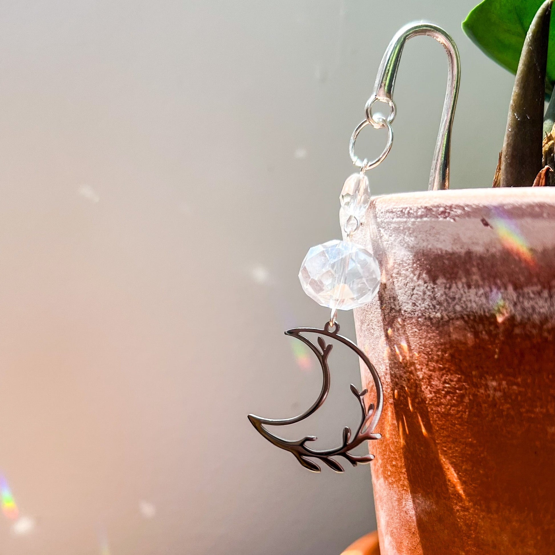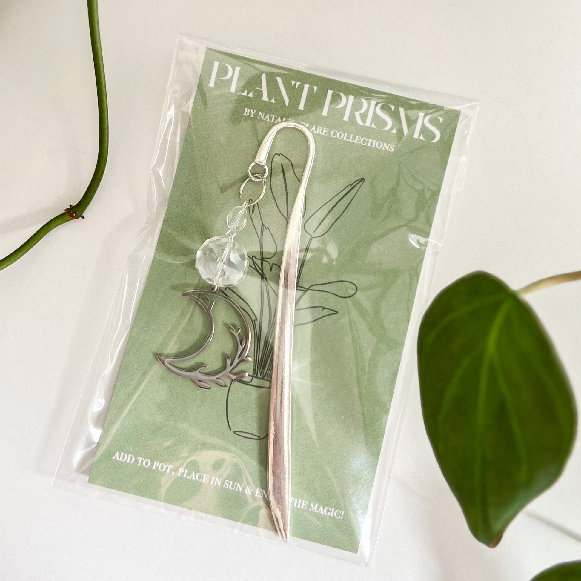 There's nothing we love more at Natalie Clare than plants and jewelry, so why not add some sparkle to your houseplants. The Silver Garden Moon Plant Prism is made of lead free silver metal with a silver branch moon charm hung from two glass prisms. This product is made to refract sunlight onto your potted plants to enhance your home with the eye-catching piece.Â