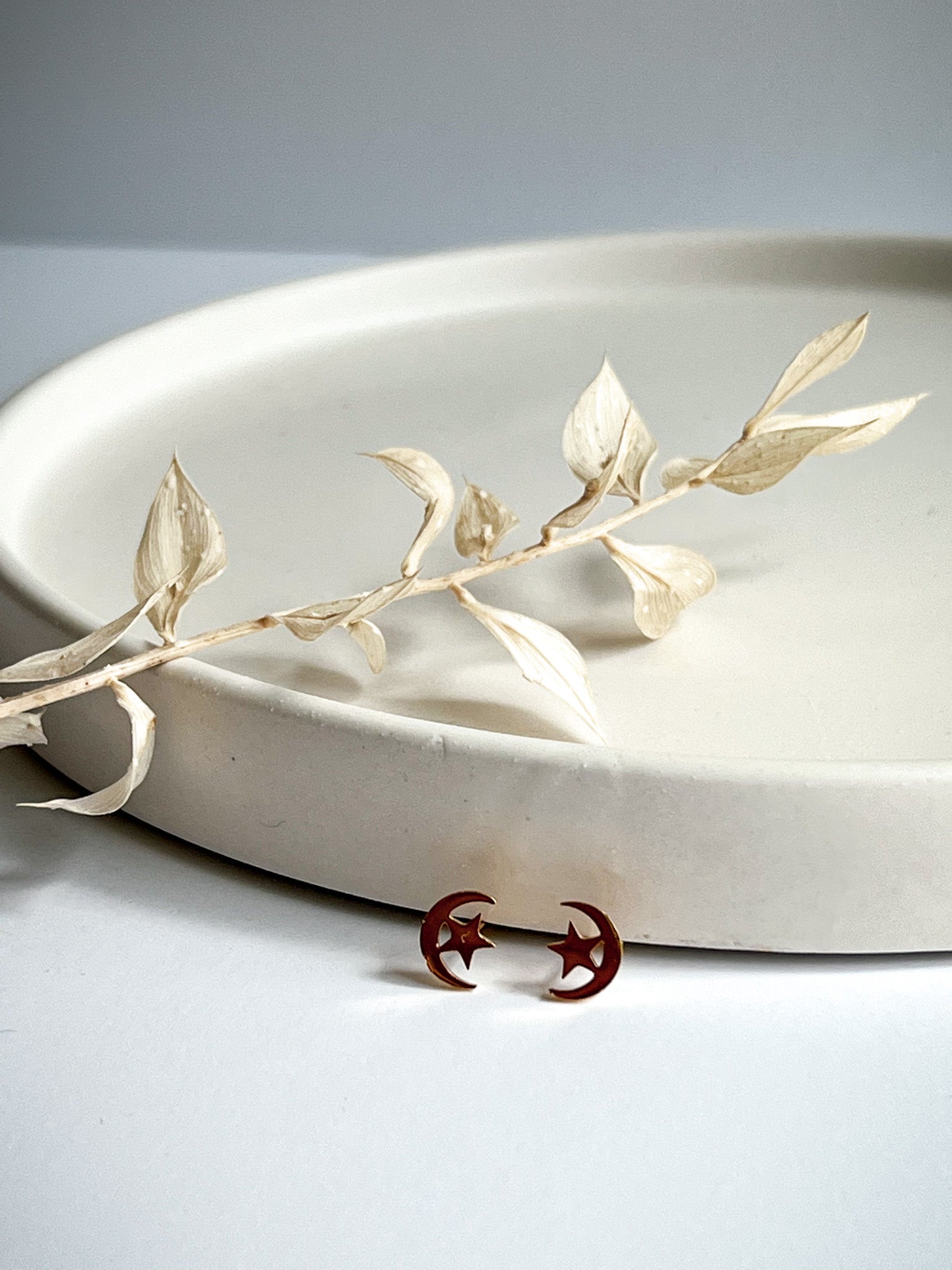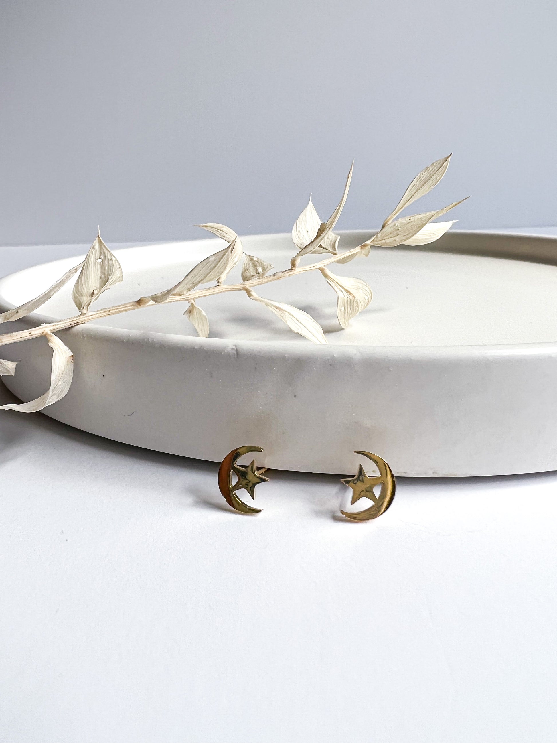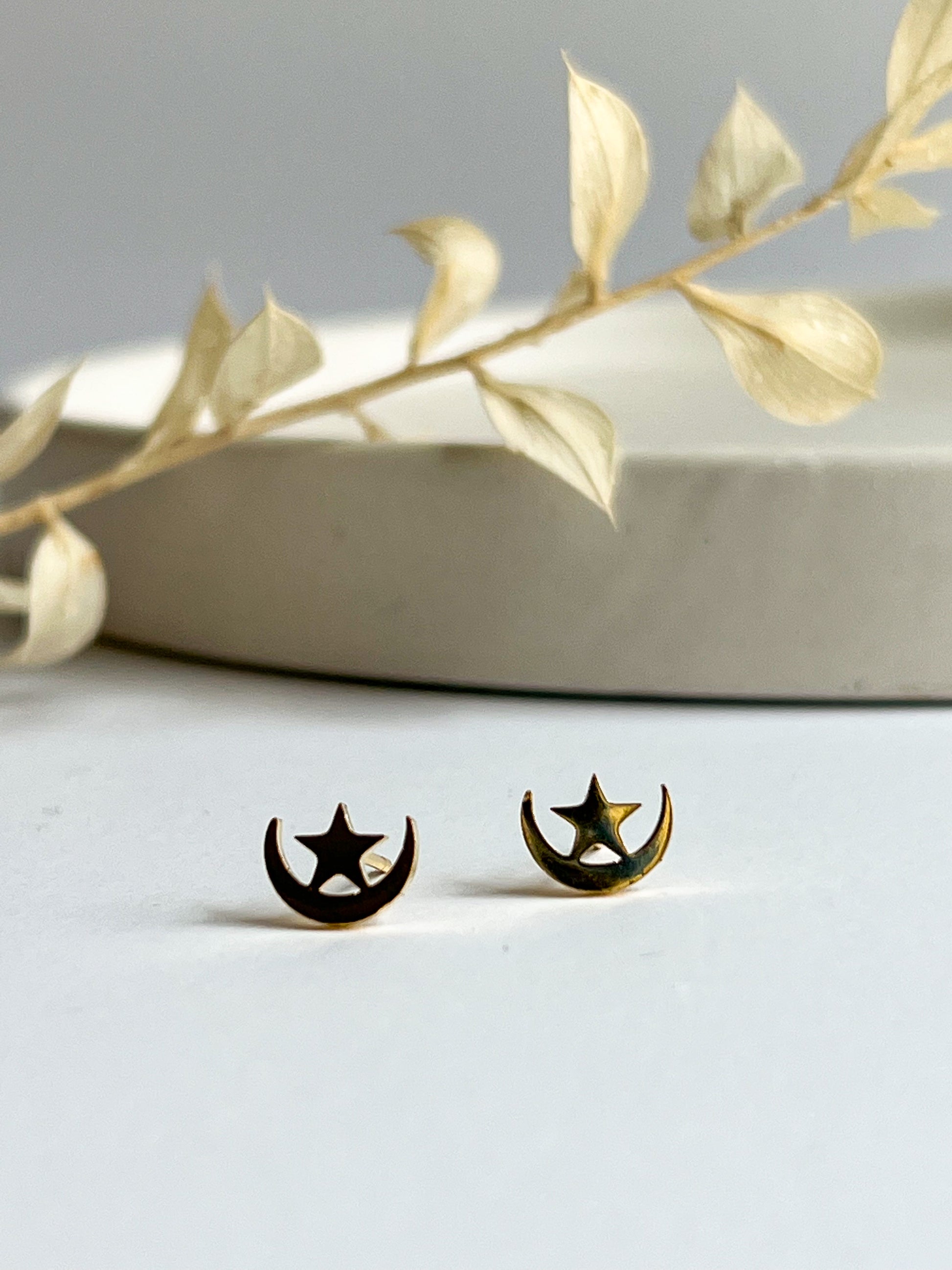Hypoallergenic golden moon and star earring studs made of stainless steel.Â