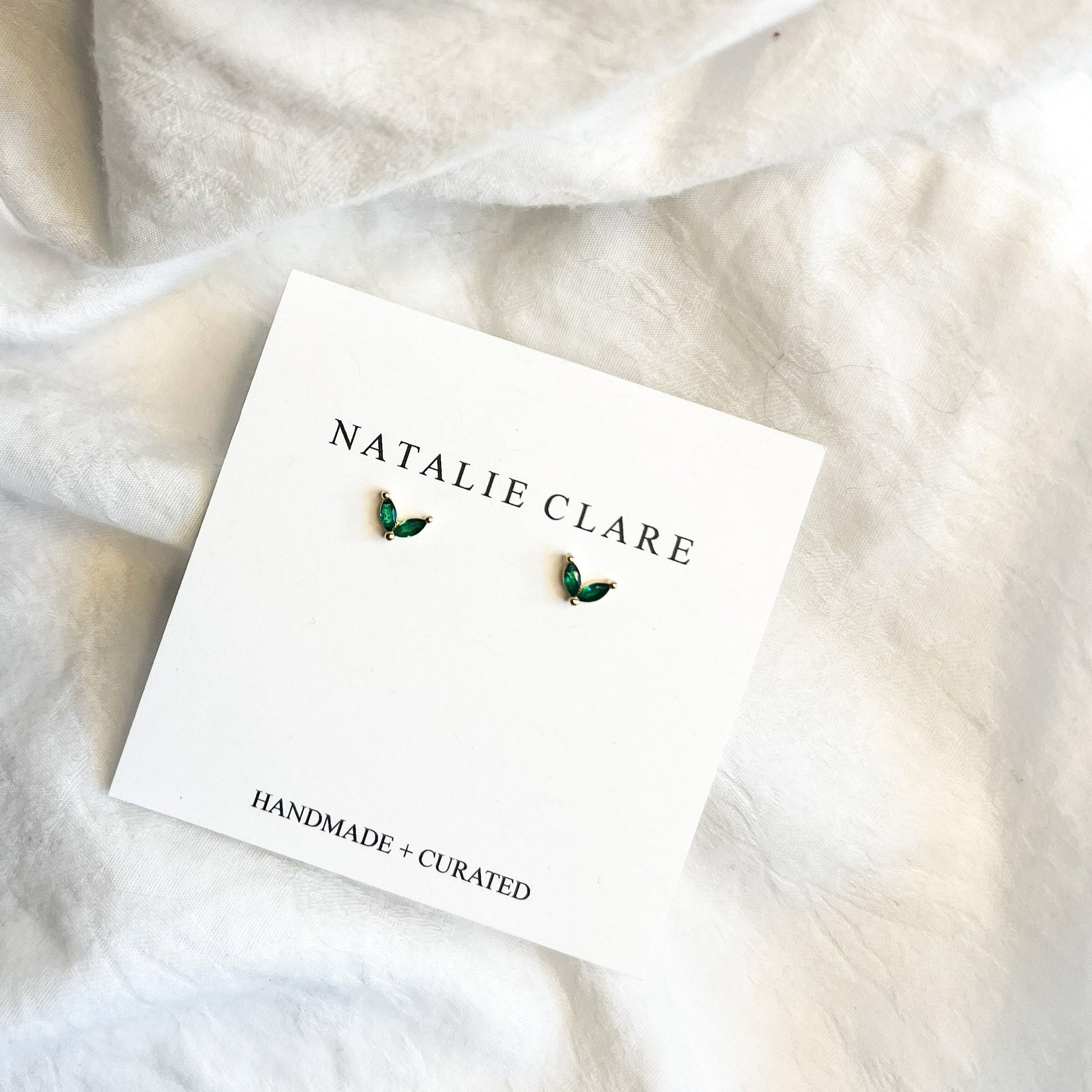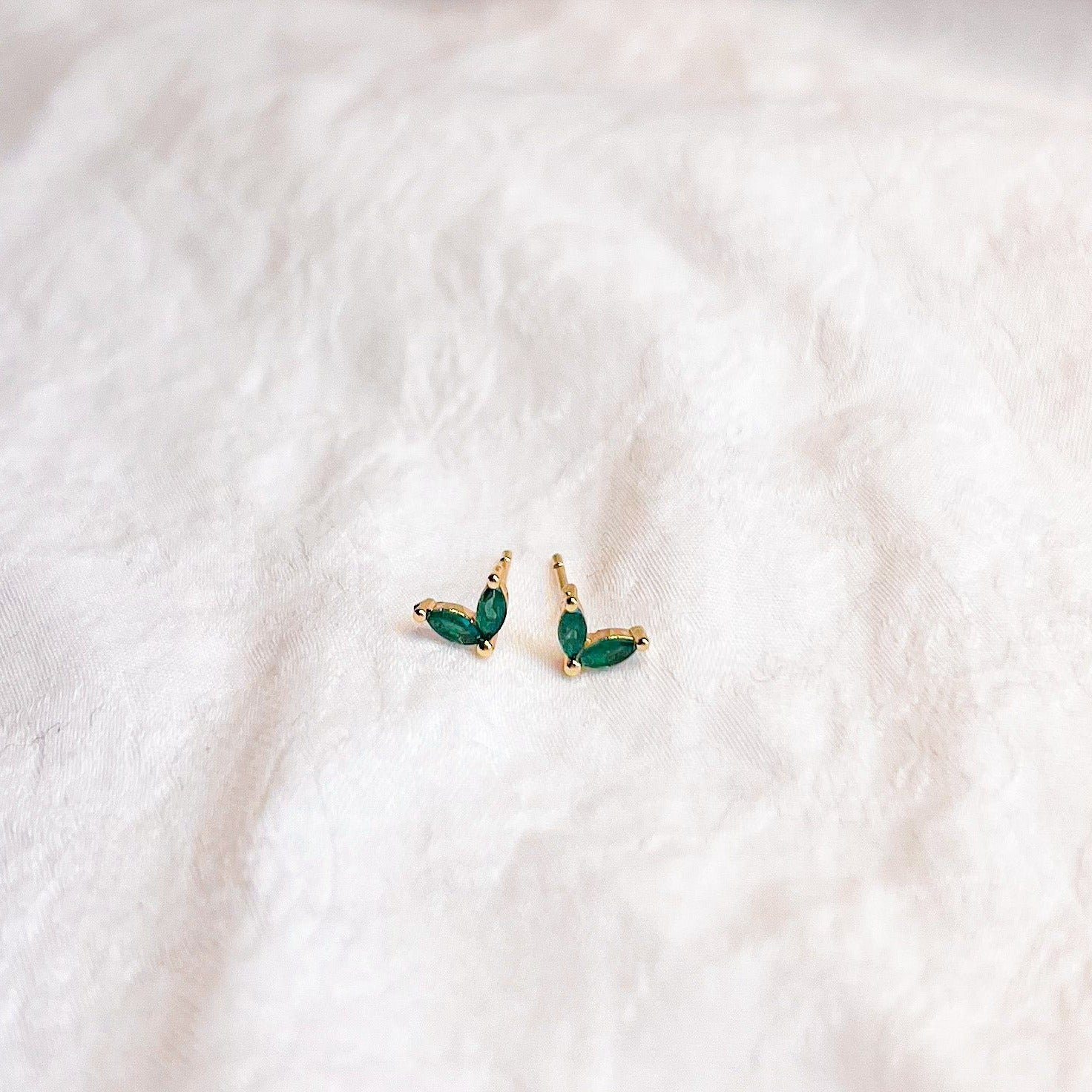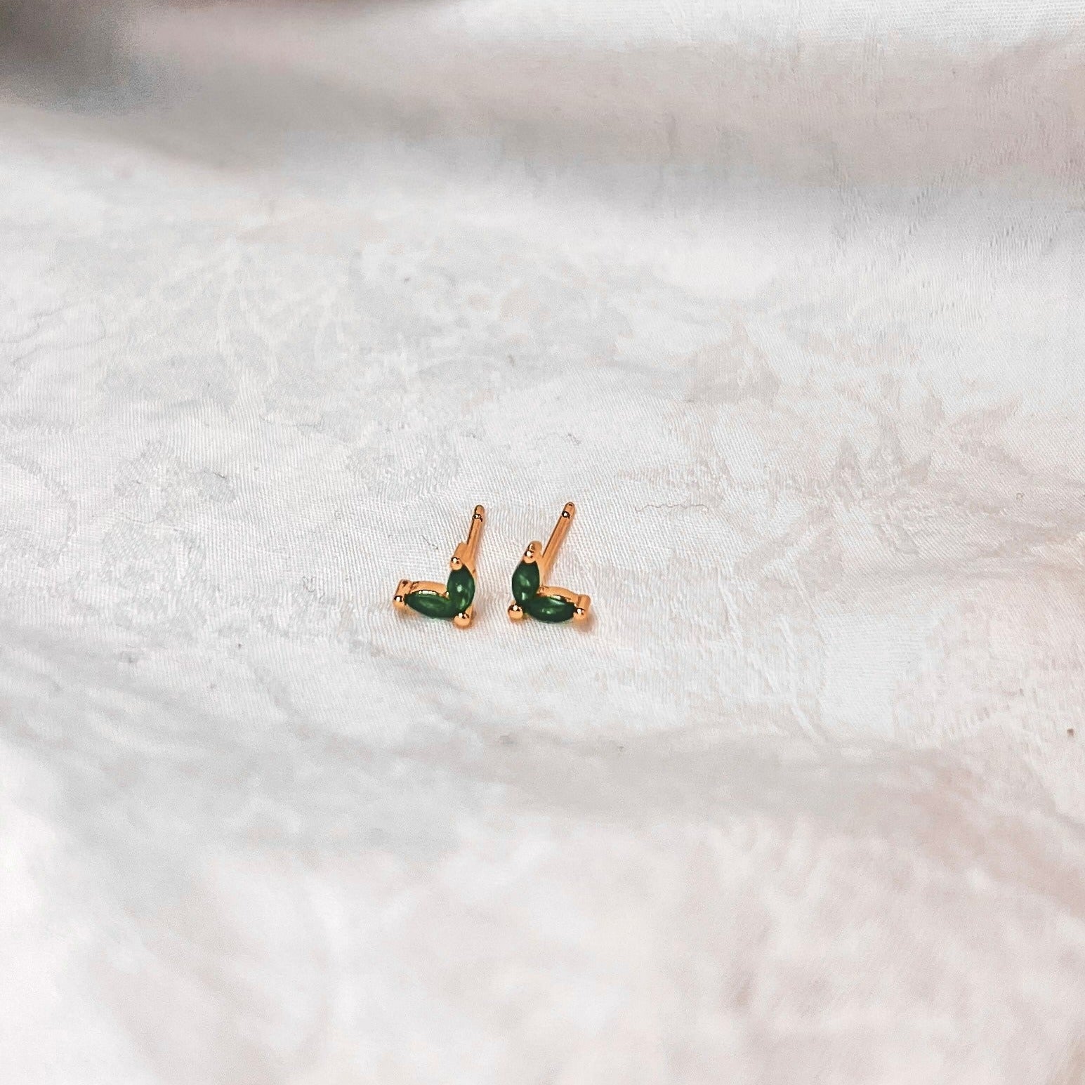 These dainty earrings are perfect for emerald lovers who don’t love the price tag; set with green cubic zirconia, these studs give the appearance of wearing emerald earrings. They are nickel free, 18k gold plated sterling silver and perfect for sensitive ears.Â