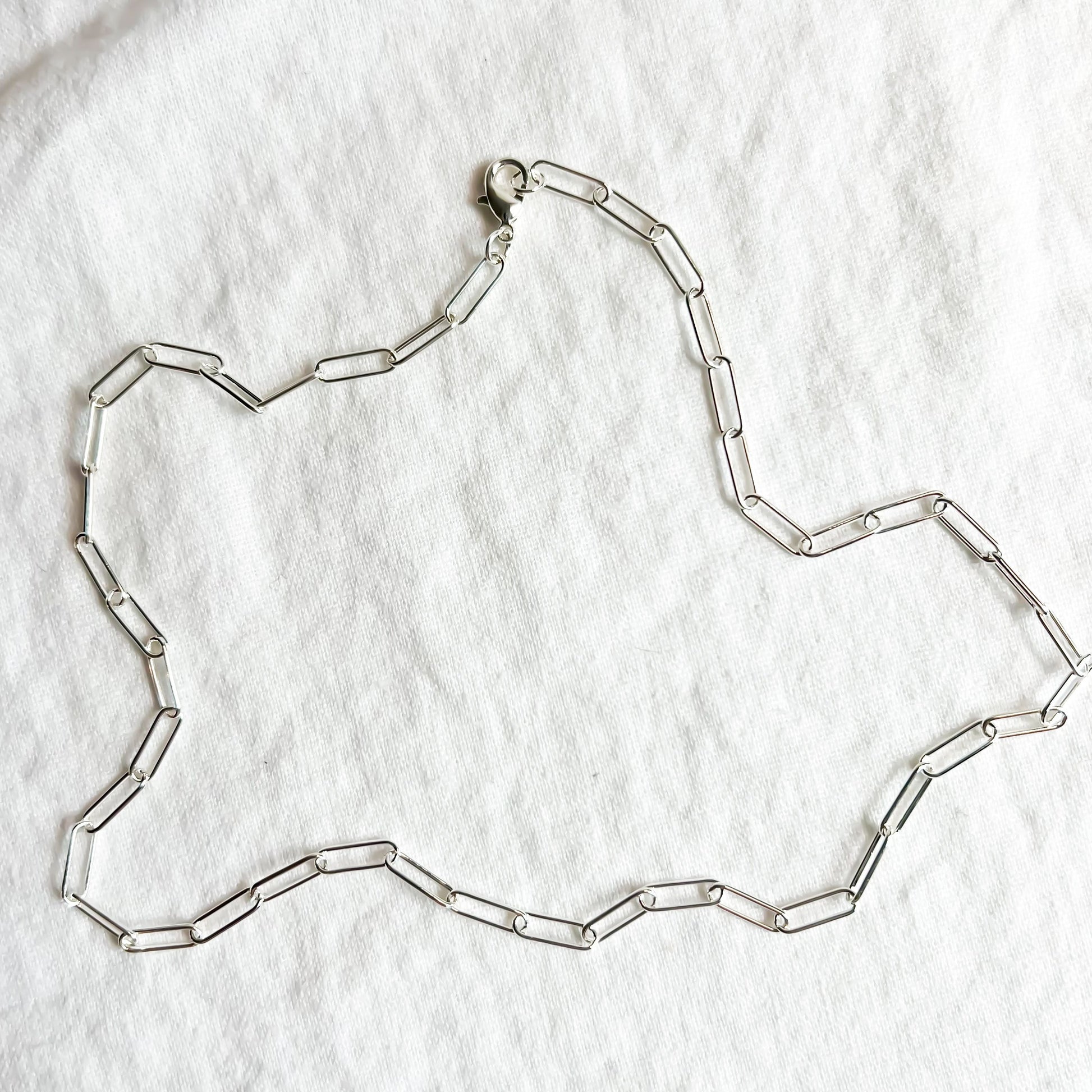 This silver chain paperclip chain is made from brass with lobster claw clasp. Measures at 18 inches but can clasp shorter for a choker style.Â
