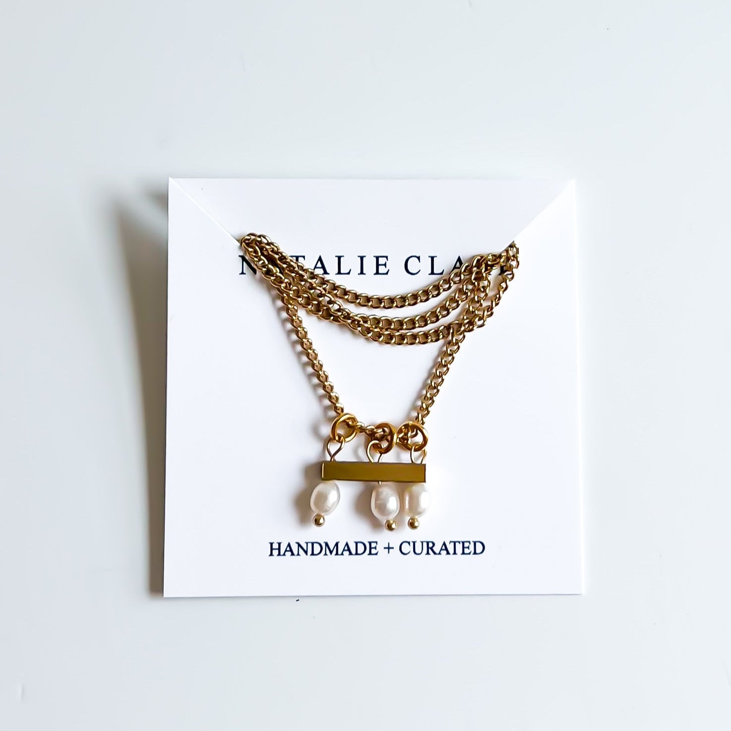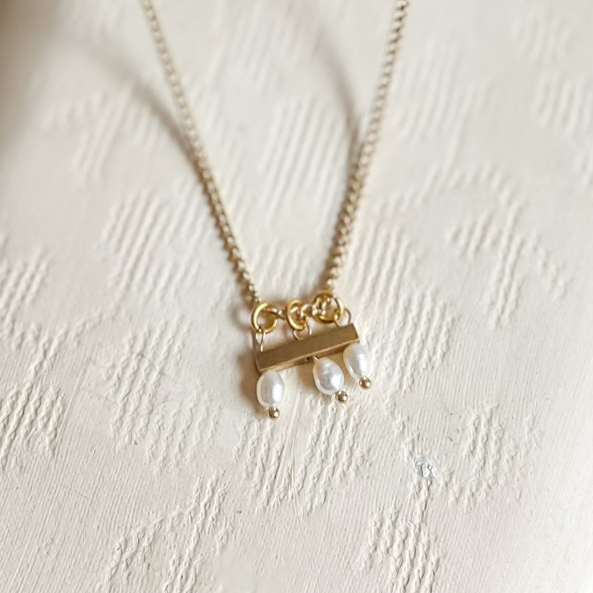 This elegant necklace features a raw brass spacer bead accented by three delicate freshwater pearls, creating a timeless and sophisticated design. Suspended on an 18-inch, 18k gold-plated chain, it offers durability with a refined finish. Perfect for layering or wearing alone, this piece combines natural beauty with expert craftsmanship for everyday elegance.