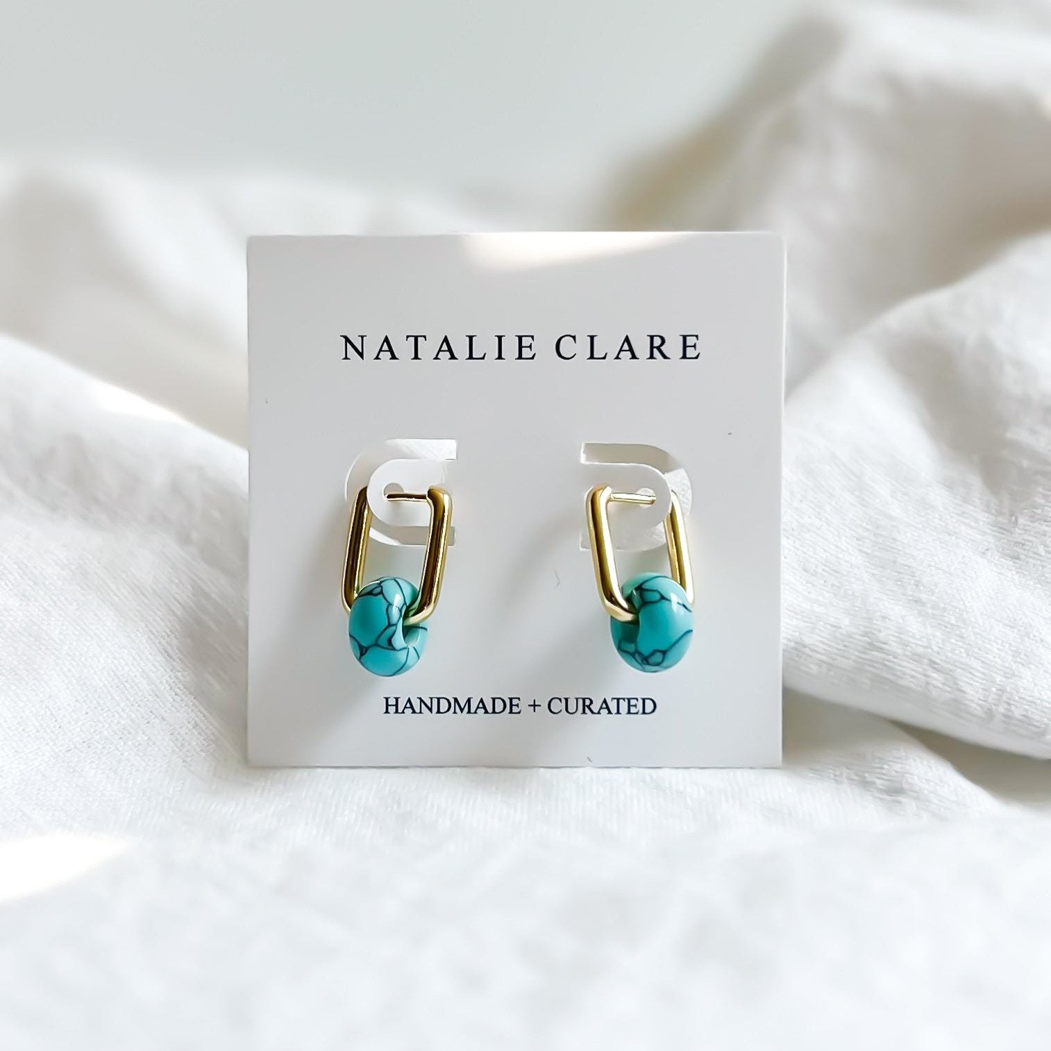 Expertly crafted with a 18k gold plated rectangle huggie hoop, these earrings feature a stunning synthetic turquoise rondelle bead.