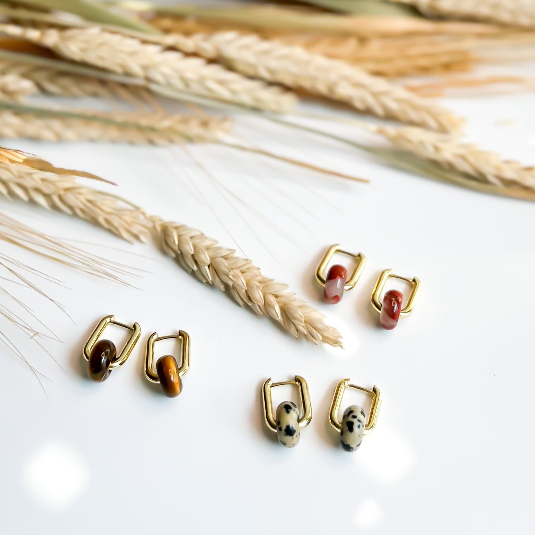 These beautifully handcrafted earrings are made with natural Tiger's Eye and 14k gold plated rectangle hoops, the classic and autumnal look is made with a stainless steel for maximum durability.
